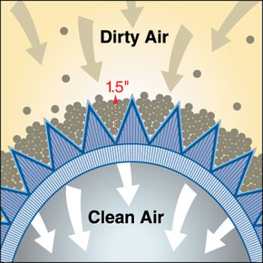 全新概念,將濾材褶高從標(biāo)準(zhǔn)的2英寸(50mm) 縮短至1.5英寸(38mm),避免了折疊、壁塌或彎折令灰塵積聚在夾縫中的可能性。堅(jiān)固的短褶濾筒, 能使反吹清潔更有效。